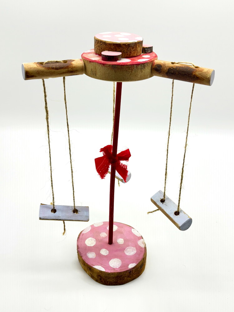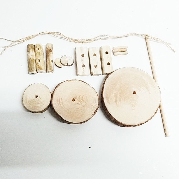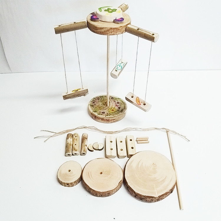 (목공풀을 구멍에 조금 넣고 30초정도 눌러주면 고정이 더 잘 됩니다.) | 2. 그네의 의자와 끈을 매달 원형 블록을 그림과 같이 묶어줘요! (목봉의 길이보다 짧게 묶어줍니다.) | 3. 목심을 이용하여 끈을 매달 원형블록과 동그란 윗판을 연결해줘요! | 4. 긴 목봉과 동그란 윗 판을 연결해줘요! (잘 돌아가는지 확인!) | 5. 목공풀을 이용하여 동그란 윗판에 나머지 꾸미기블록을 붙여주면 완성! |